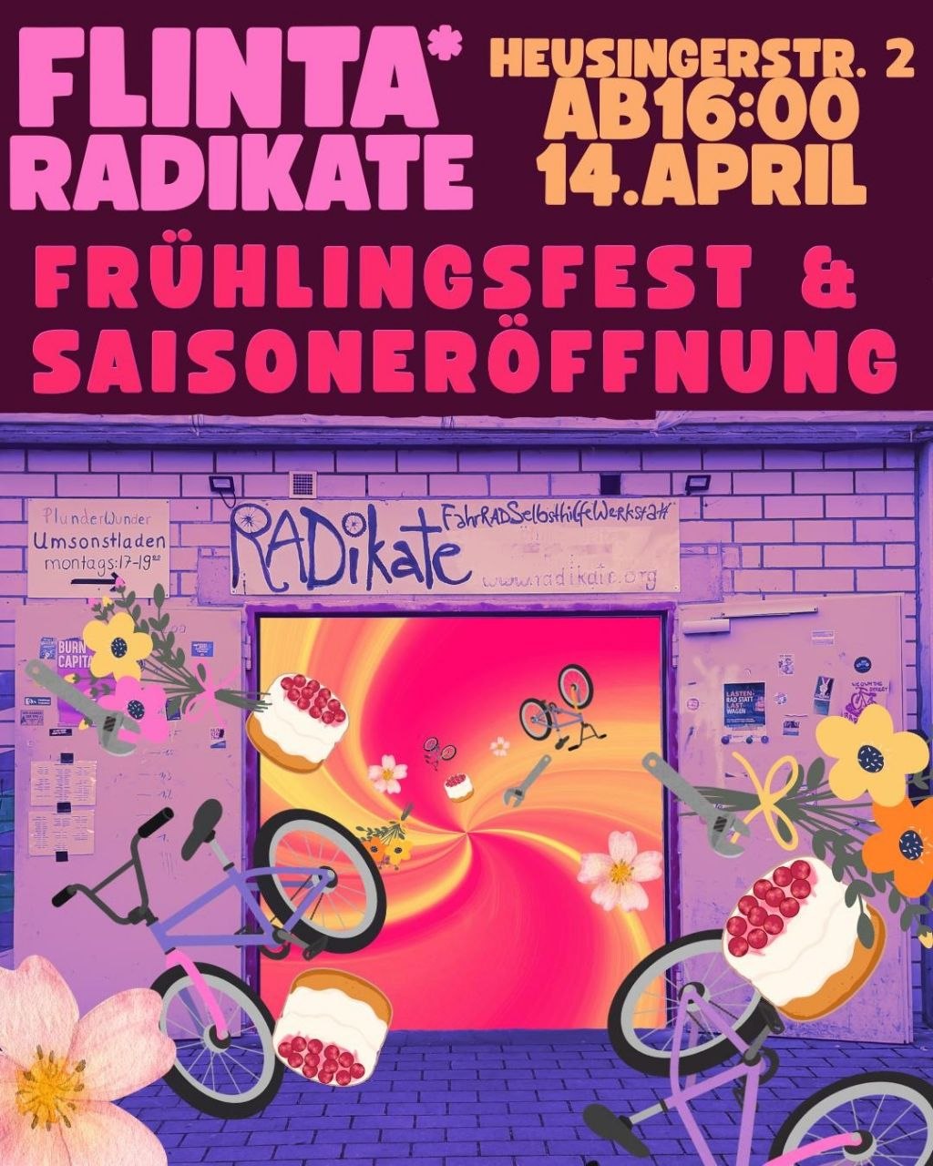 Wir organisieren eine alternative FLINTA*-Öffnungszeit für alle, die sich als FLINTA* verstehen. Damit wollen wir einen Werkstattraum für alle öffnen, die die Radikate innerhalb einer geschützteren FLINTA*-Gruppe nutzen wollen. Mit dieser Öffnungszeit sprechen wir ausschließlich FLINTA*-Personen an. Alle anderen können zu den Donnerstagsöffnungszeiten kommen.